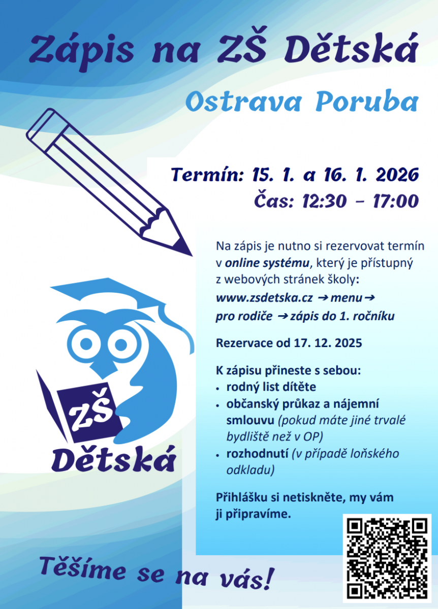 Zápisy do ZŠ se nově od školního roku 2025/2026 konají od 15.1. do 15.2. 2026. Konkrétní datum bude zveřejňovat každá ZŠ samostatně.
