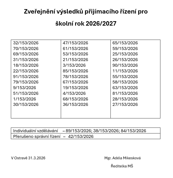 Zveřejnění výsledků přijímacího řízení pro školní rok 2026/2027